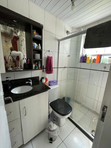 ✔️ Banheiro com pia de granito, armário sob medida e box de vidro