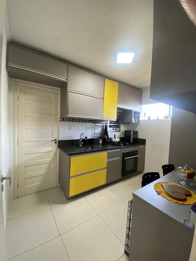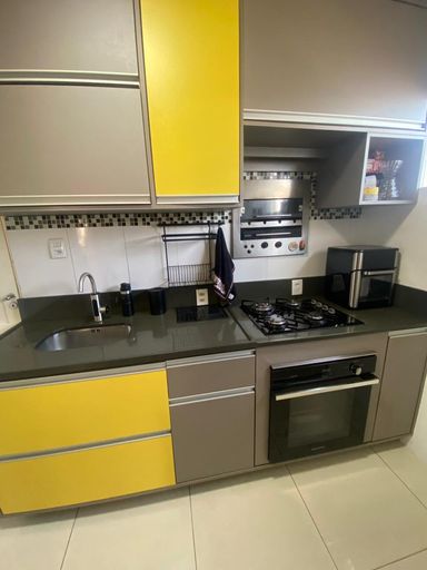 • Cozinha grande com móveis planejados sob medida, pia em mármore e churrasqueira embutida